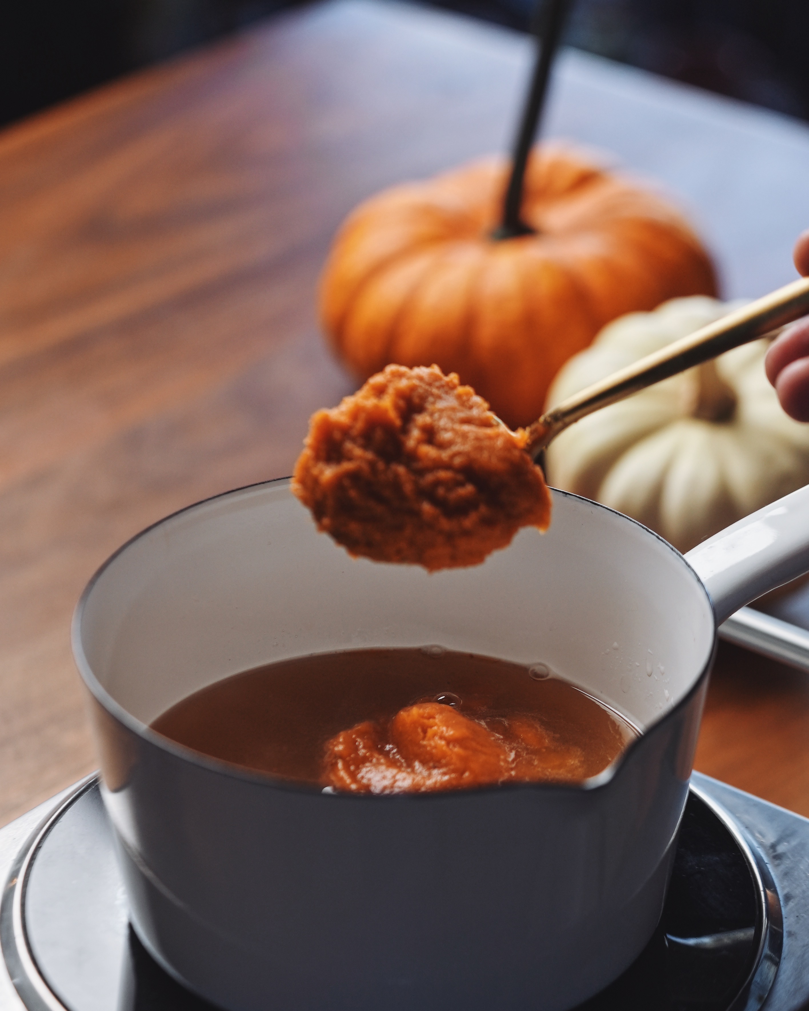 Add pumpkin: Stir in the pumpkin purée and whisk until fully combined. Let it steep off heat for another 10 minutes.