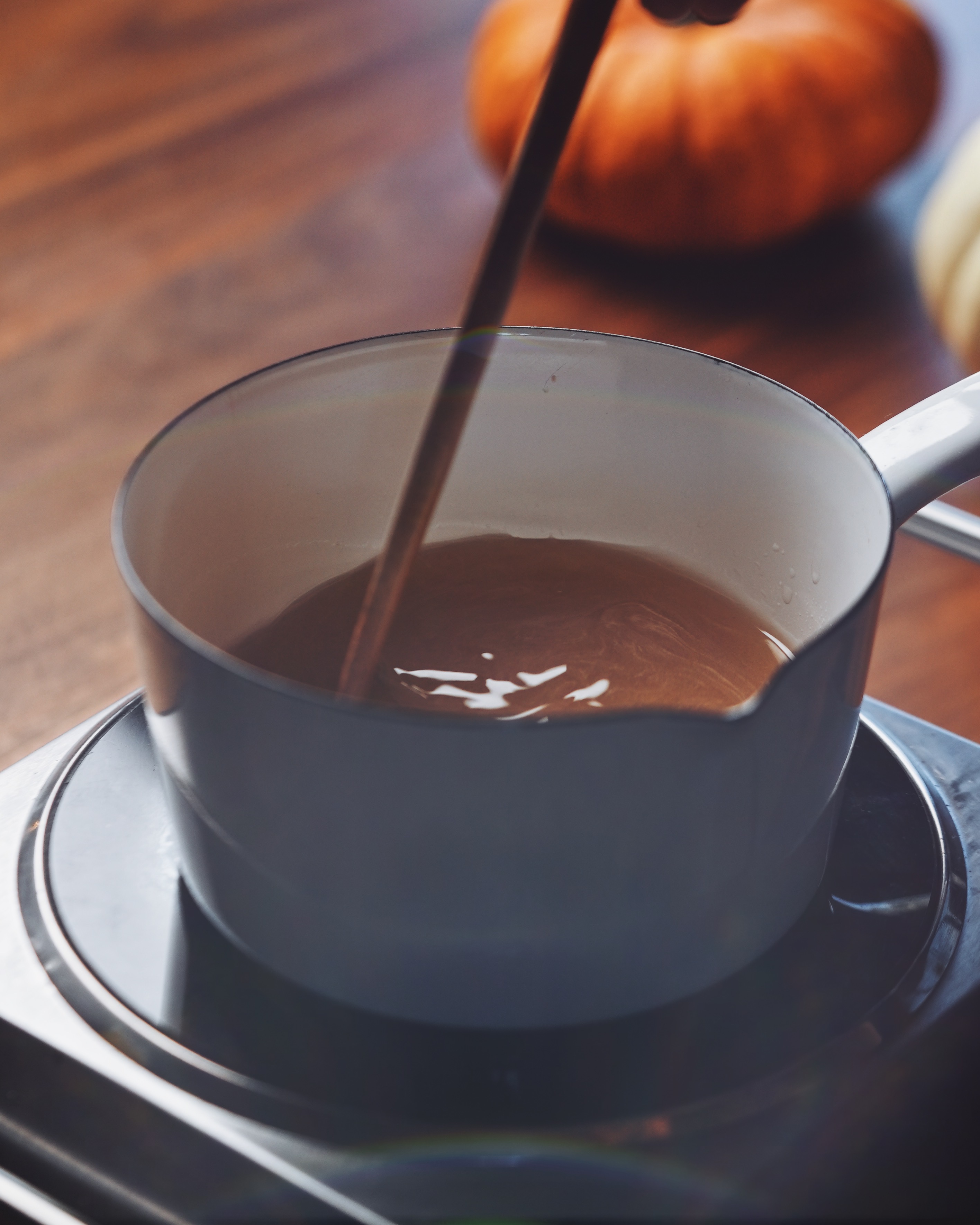 Whisk in pumpkin + spice blend: Add the pumpkin purée and spice blend, whisking until smooth. Let it steep for 5 minutes off heat.
