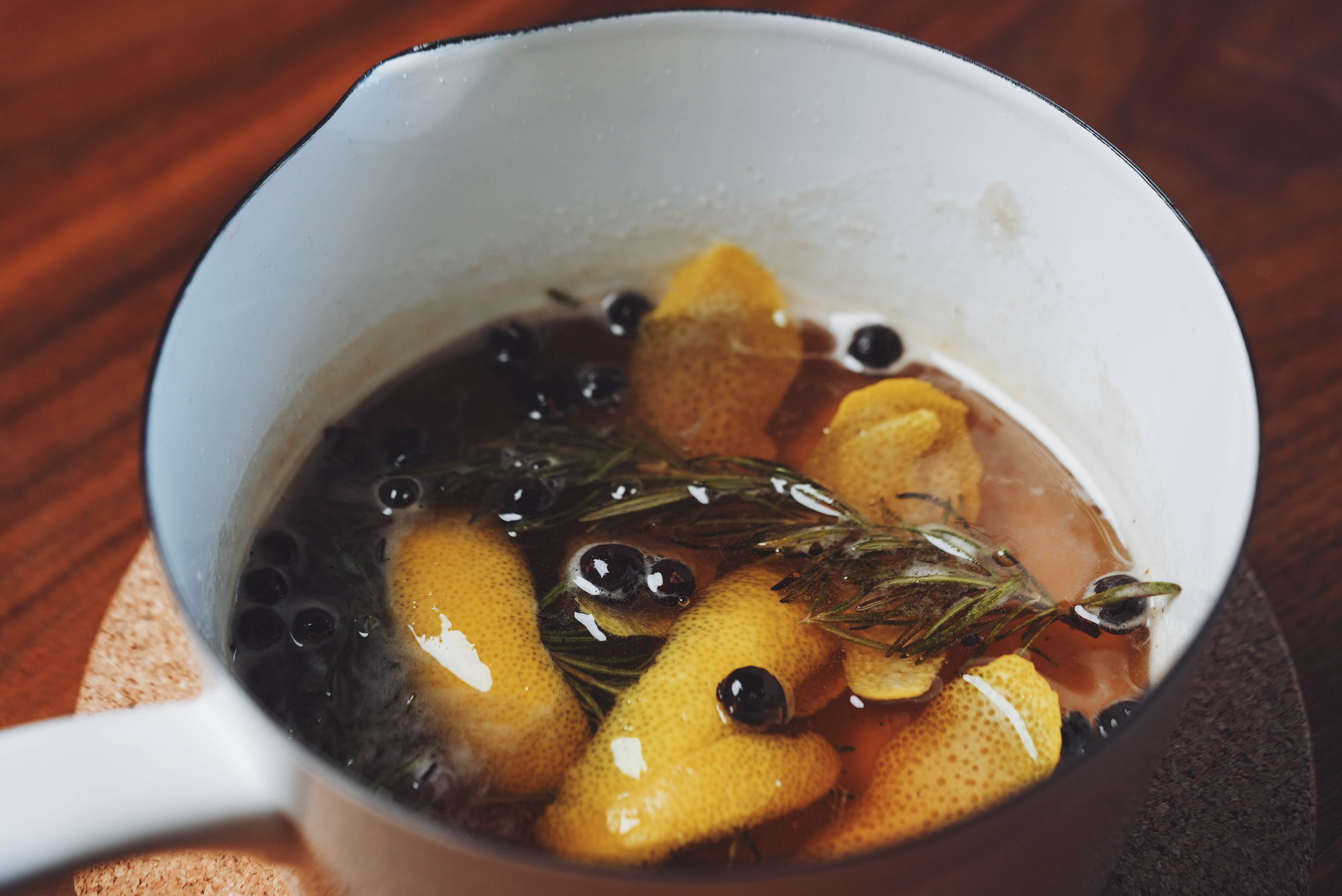 Add the rosemary, crushed juniper, lemon peel, and a pinch of salt. Let the mixture steep on low heat for about 10 minutes. The aroma should smell like fresh-cut pine. -